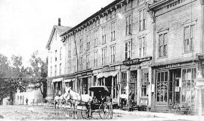 Photo: California and Union Block was a row of wooden business blocks until it burned during a typical lake effect blizzard in January 1912. The California Block was built in 1854 at the corner of Main and Railroad (Harwood Drive) Streets and the Union Block, which housed four store fronts, was added by 1861. The Colony Block at the right, with its “twin,” the Cook Block, which is just outside the area of this view, dated from the late 1870’s.
