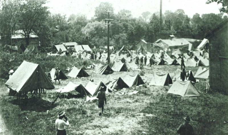 Photo: World War I – Soldiers tenting at the Gas Mart site (North Main Street, Sandy Creek) on their way to Pine Camp (Fort Drum).