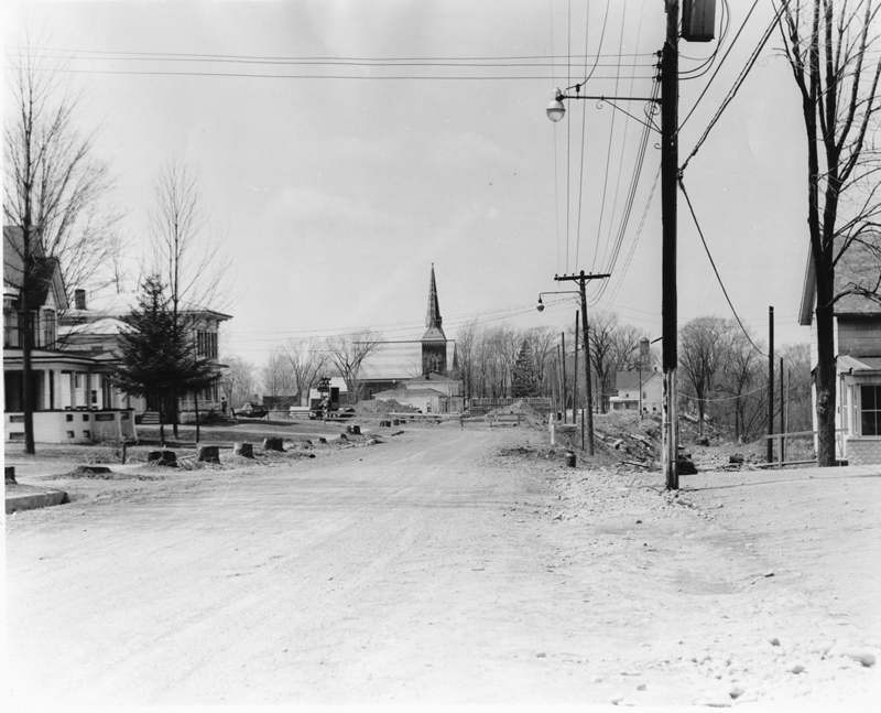 This great photograph showing Harwood Drive during the construction of Rt. 81, beginning on the left shows Summerville Funeral Home, the VanRy family home, the Rt. 81 ramp, going north and south and in the middle of the picture is the United Methodist Church. The opposite side of the road is where the Allen Opera House was located, originally built in 1831 as the Methodist Episcopal Church, it also served as the home for the Grange until March 21,1960 when it was taken down to make way for the construction of Interstate Route 81.