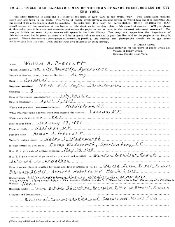 World War I –Veterans – Town of Sandy Creek – The War to End All Wars