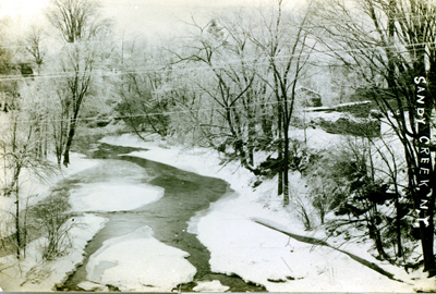 He built the house where Pitt Barker (South Main Street) and set out large quantities of rhubarb, intending to make rhubarb wine. For years the place was known as the Cottrell Farm, then the Sterns farm. It was mostly thick timber land; only a few acres along the road being tillable. The woods extended up nearly to the old Syracuse Northern Railroad bed and it was the wonderful hunting, trapping and fishing grounds of many of the Sandy Creek boys. There were originally only 35 acres in the farm, though the woods joined the Root farm which took in several acres more, also covered with thick timber of beech, birch, maple, hemlock, spruce and some soft pine which was gradually cut for both lumber and firewood, leaving only the maples.