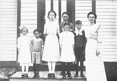 Photo: Sage School District #6: Left to right Genevra Upton; Bessie Stevens (Goodfellow); Florence Cooper (Ott); Rex Hilton; Ethel Upton; Donald Kent; Alice Williams teacher (Jeanes). Ca. 1912