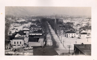 The house on North Main Street at the extreme left, towards the east, was the Tifft home; to the right of that is the old Sandy Creek Fire Department building, built in 1898 (today Irv’s Barber Shop). On the corner is Kesslers Store (then Prytherch Dry Goods Store and today an antique store) In the foreground, opposite the fire hall and Kesslers, is the roof of Gib Roberts barbershop and the Corner Drug Store. The Davies/Burritt business block, at the lower right, on the corner of Lake Street and South Main Streets, built in 1899, has housed many different businesses in its day. |